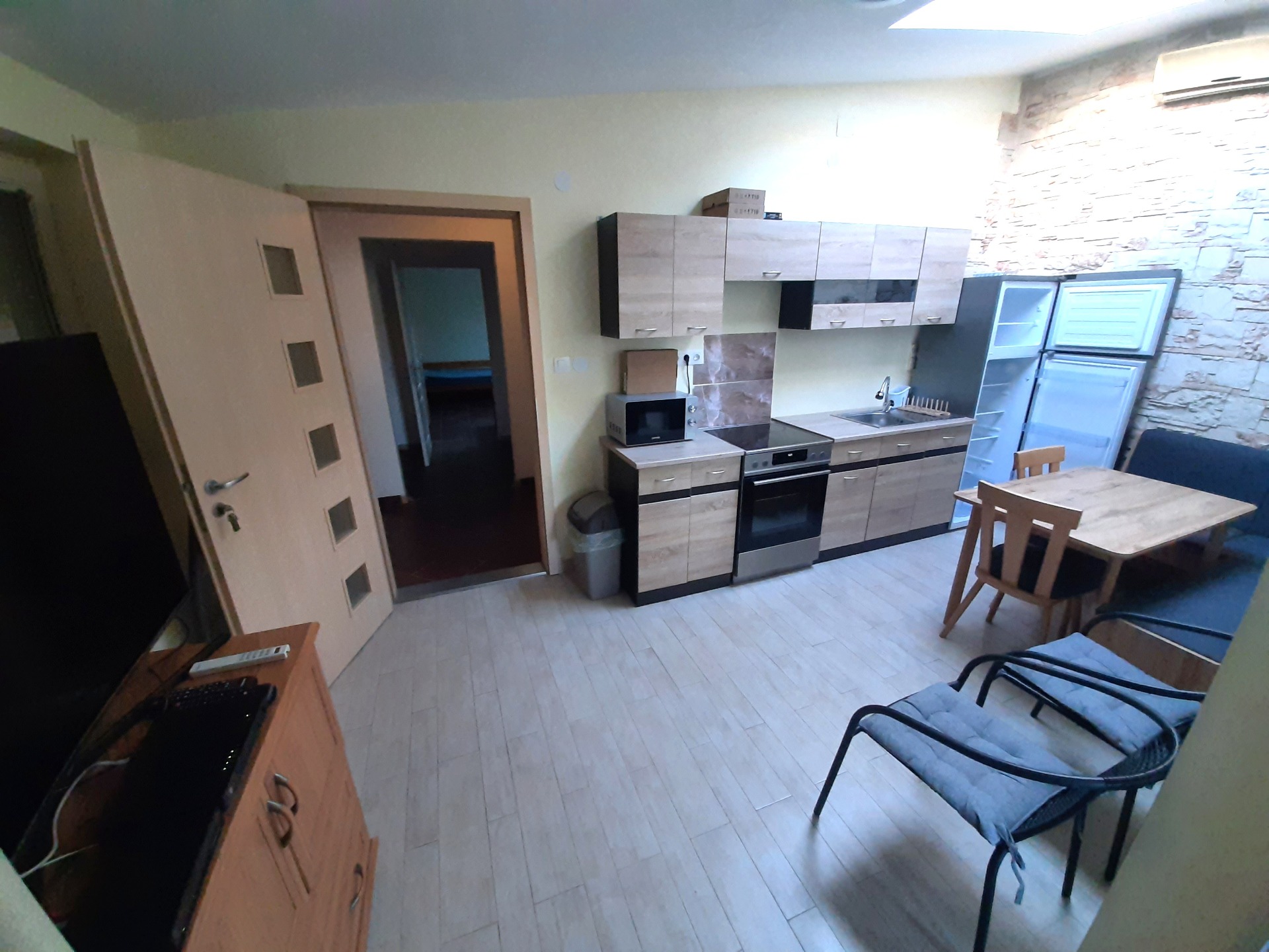 - közös konyha + étkező, mely jól felszerelt konyhai gépekkel: kombinált hűtő, mikrohullámú sütő, elektromos tűzhely, mosogatótálca és konyhai eszközök